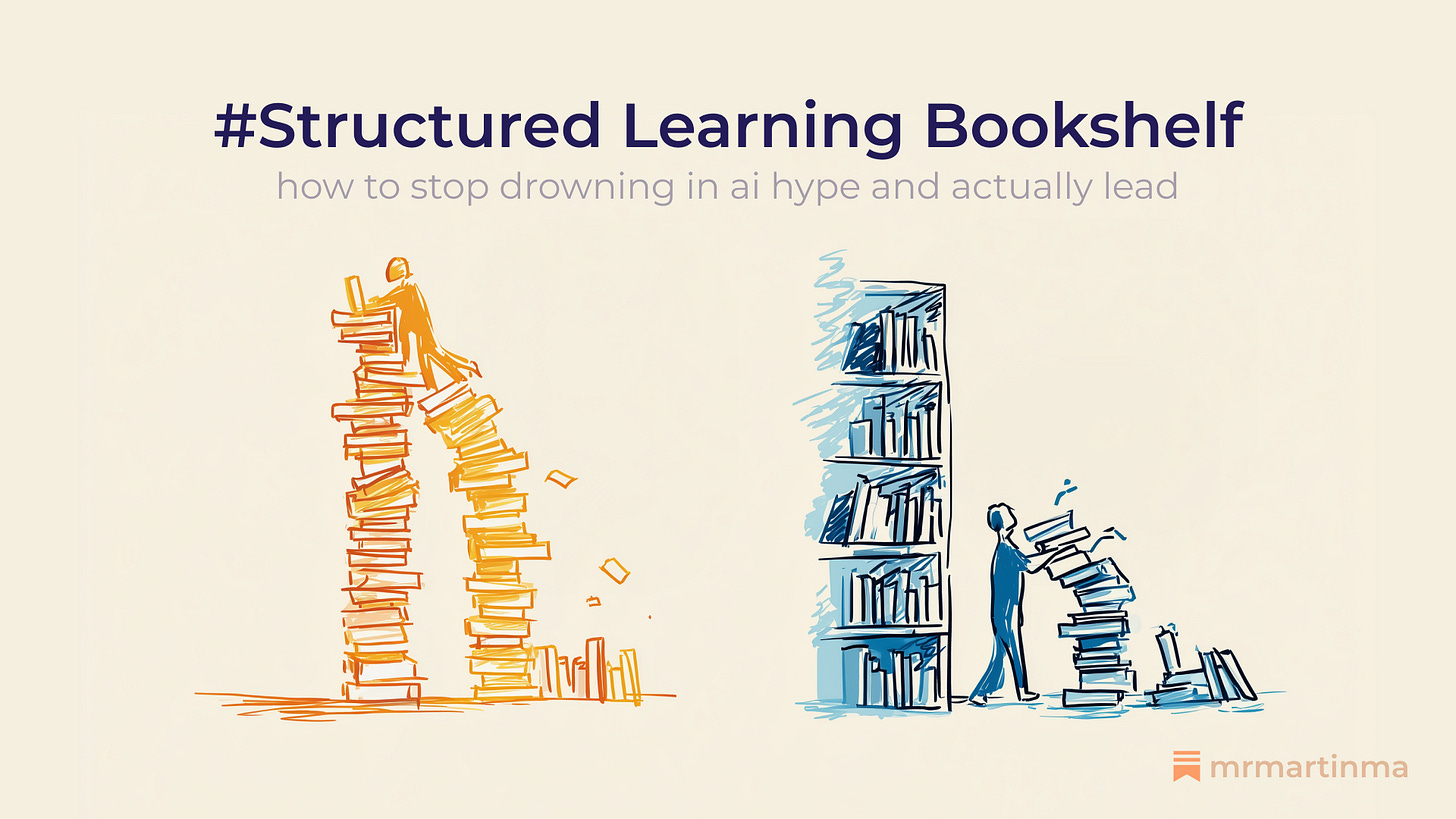 The shelves = Categories that organize what matters to your leadership (AI Applications, Customer Strategy, Team Dynamics, Financial Reality, etc.)