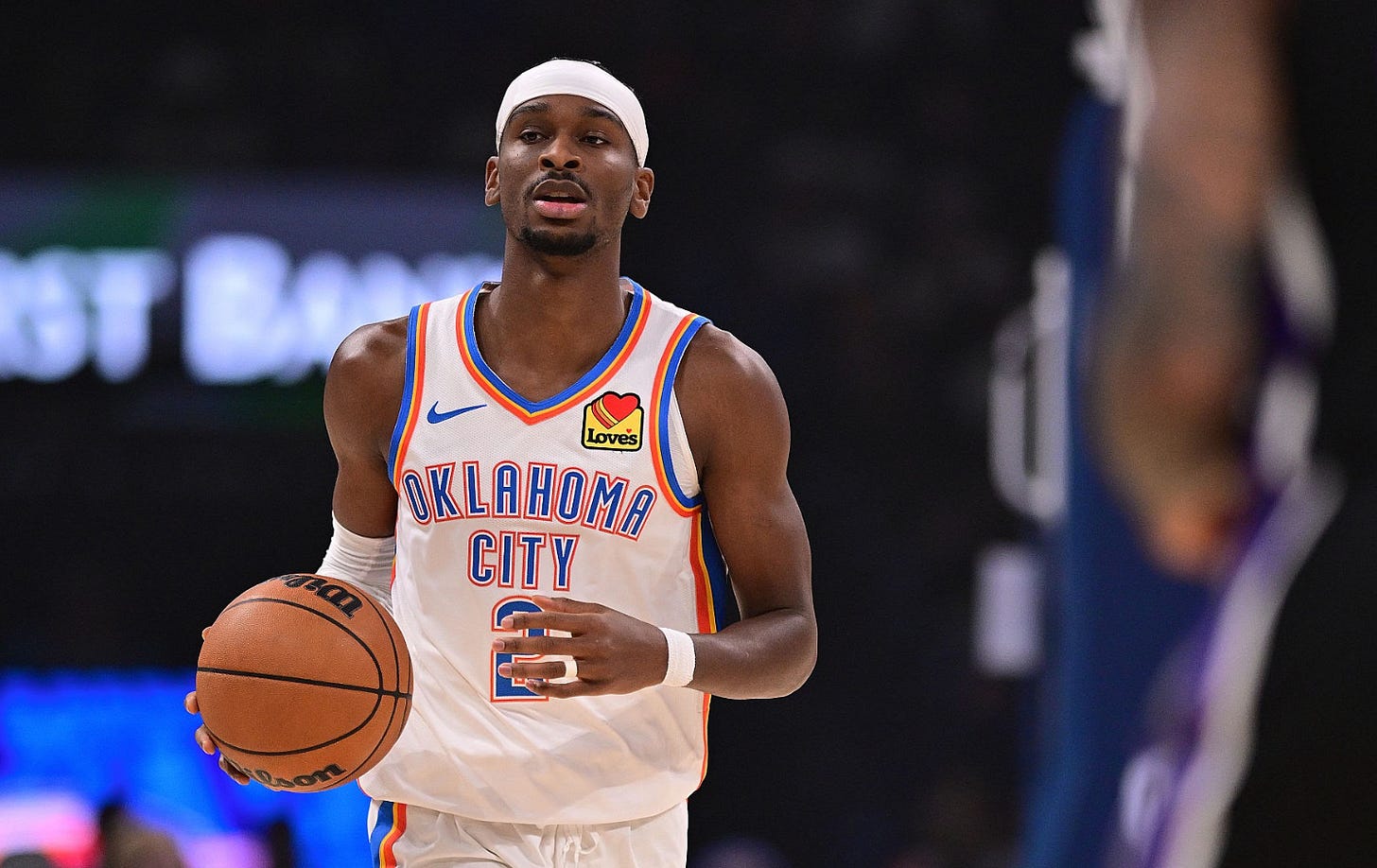 I was looking at the box scores for the Thunder recently, and Shai Gilgeous-Alexander’s averaging over 30 points per game, he’s leading the league in steals, and he’s shooting with an efficiency that defies modern usage rates.